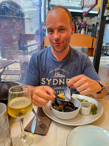 Ça y est, de grosses gouttes de pluie commencent à s'écraser sur nos têtes ! Comme il est 18h30, nous cherchons un petit restaurant sympa pour souper. Ce n'est pas ce qui manque par ici, habitués à alpaguer les touristes, les racoleurs nous accostent de tous les côtés pour nous inciter à choisir leur restaurant ! C'est bien la chose que l'on déteste, nous essayons de regarder les cartes des menus mais presque tous les restaurants proposent la même chose, donc nous y allons au hasard. Nous choisissons des moules et octopus accompagnés de pommes de terre et de côtes de bettes. C'était très bon !